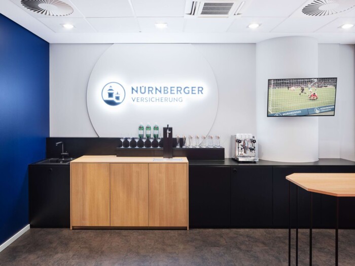 Die Ehrenloge im Stadion verbindet Fankultur mit Raumdesign. Farben und Formen spiegeln das CI der Nürnberger Versicherung wider, die Architektur des Stadions fließt in die Gestaltung ein. Ein Ort für Begegnung, Austausch und echte Fußballmomente – vor, während und nach dem Spiel.